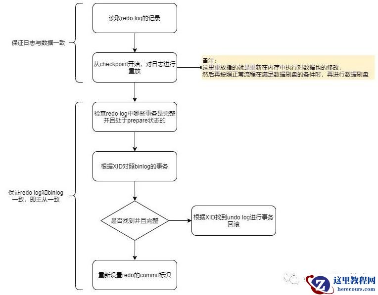 问题:假设事务提交过程中,MySQL进程突然奔溃,重启后是怎么保证数据不丢失的?下图就是MySQL重启后,提供服务前会先做的事 -- 恢复数据的流程: