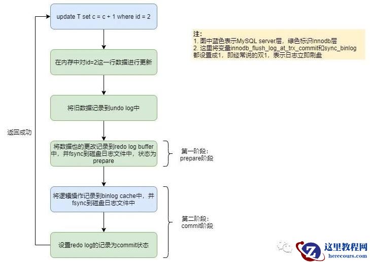 因为crash-safe主要体现在事务执行过程中突然奔溃,重启后能保证事务完整性,所以在讲解具体原理之前,先了解下MySQL事务执行有哪些关键阶段,后面才能依据这几个阶段来进行解析。下面以一条更新语句的执行流程为例,话不多说,直接上图:从上图可以清晰地看出一条更新语句在MySQL中是怎么执行的,简单进行总结一下: