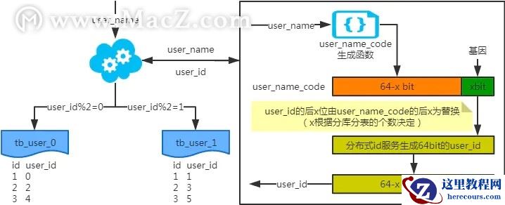 注:写入时,基因法生成user_id,如图。关于xbit基因,例如要分8张表,23=8,故x取3,即3bit基因。根据user_id查询时可直接取模路由到对应的分库或分表。根据user_name查询时,先通过user_name_code生成函数生成user_name_code再对其取模路由到对应的分库或分表。id生成常用snowflake算法。