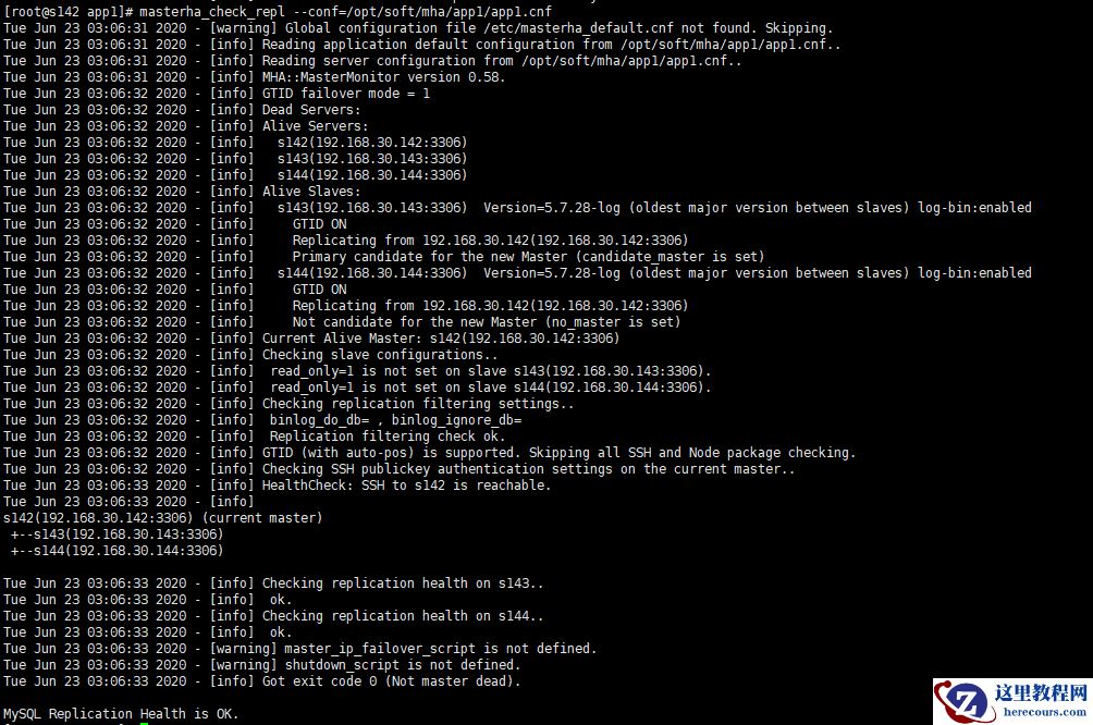 [server default] manager_workdir=/opt/soft/mha manager_log=/opt/soft/mha/manager.log password=111111user=root ping_interval=1repl_password=111111repl_user=canal_repl_user#master_binlog_dir=/usr/local/mysql/logs #secondary_check_script=masterha_secondary_check -s s142 -s s143 -s s144 #master_ip_failover_script="/opt/soft/mha/scripts/master_ip_failover"#master_ip_online_change_script="/opt/soft/mha/scripts/master_ip_online_change"#report_script="/opt/soft/mha/scripts/send_report"#ssh用户 ssh_user=root [server1] hostname=s142 port=3306master_binlog_dir=/usr/local/mysql/logs candidate_master=1check_repl_delay=0[server2] hostname=s143 port=3306master_binlog_dir=/usr/local/mysql/logs candidate_master=1check_repl_delay=0[server3] hostname=s144 port=3306master_binlog_dir=/usr/local/mysql/logs ignore_fail=1no_master=1