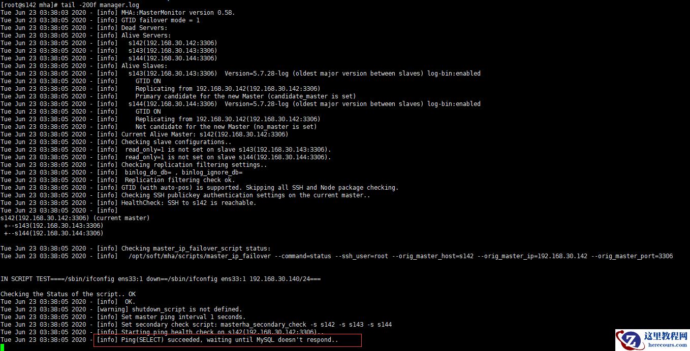 说明MHA正在运行中,主节点是s142
