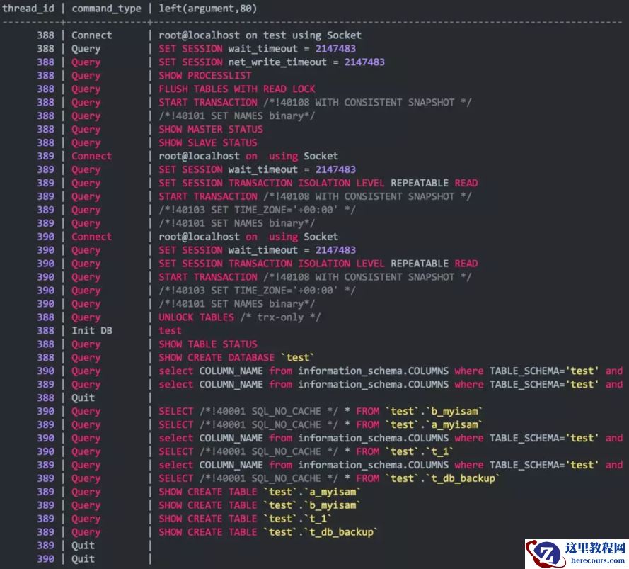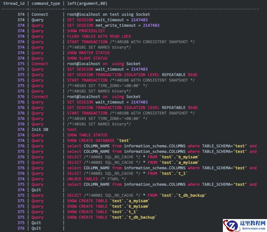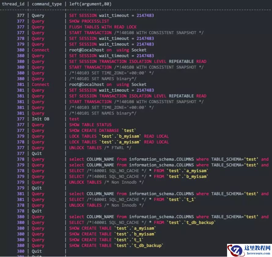 实际上,②和③顺序也是可以调换的(应该是并行的),在mydumper跑备份的时候,输出里stdout可以体现,节选如下: