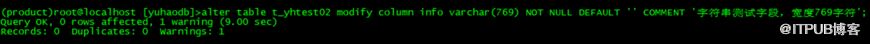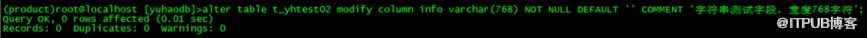 耗时较短,0.01秒执行完毕,符合预期(2.3.2)扩到768(为当前区间上限值),期望结果为立刻执行完毕alter table t_yhtest02 modify column info varchar(768) NOT NULL DEFAULT '' COMMENT '字符串测试字段,宽度768字符';