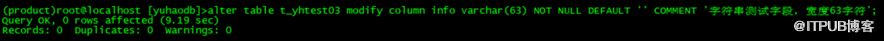 (3.1) 测试字符串宽度扩充至第一个区间范围最大值63,测试执行时长,期望结果为立刻执行完毕alter table t_yhtest03 modify column info varchar(63) NOT NULL DEFAULT '' COMMENT '字符串测试字段,宽度63字符';