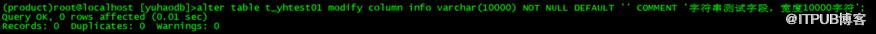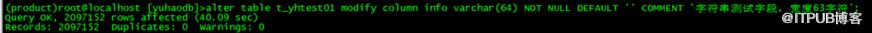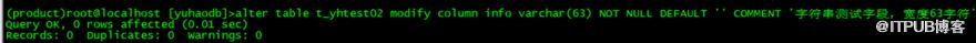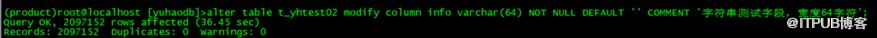 测试字符串宽度跨区间扩宽度值下一区间最小值64,测试执行时长,期望结果为耗时很久,comment内容没有改这部分暂不考虑alter table t_yhtest01 modify column info varchar(64) NOT NULL DEFAULT '' COMMENT '字符串测试字段,宽度63字符';