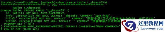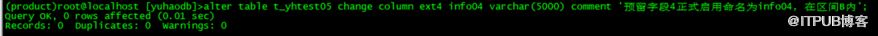 执行耗时0.01s,立刻生效,符合期望(7)测试将预留字段ext4调整到特定区间内宽度5000,并重命名为info04,修改comment内容,期望结果为立刻生效alter table t_yhtest05 change column ext4 info04 varchar(5000) comment '预留字段4正式启用命名为info04,在区间B内';