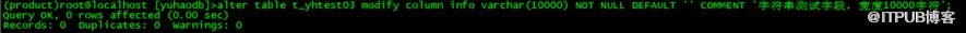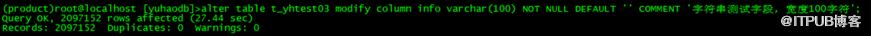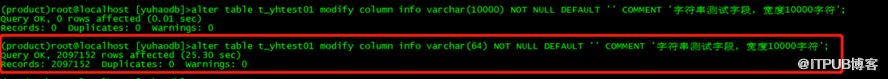 耗时很长,22.28秒执行完毕,符合预期(3.3) 测试字符串在最大宽度区间内64+的字段扩充操作,期望结果耗时很短立刻完成alter table t_yhtest03 modify column info varchar(10000) NOT NULL DEFAULT '' COMMENT '字符串测试字段,宽度10000字符';