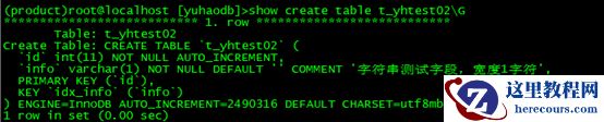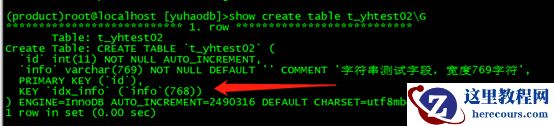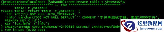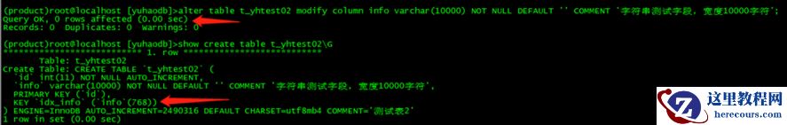 索引变成了前缀索引且对应前缀能覆盖的字节数上限3072,也就是768字符(2.5) 继续调大到10000宽度,期望能瞬时完成alter table t_yhtest02 modify column info varchar(10000) NOT NULL DEFAULT '' COMMENT '字符串测试字段,宽度10000字符';