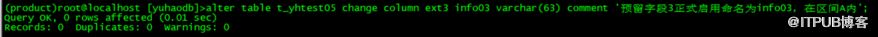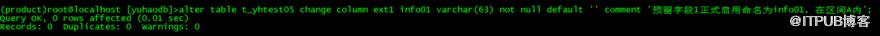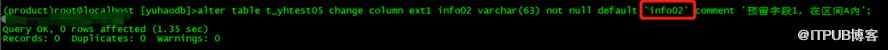 (2)测试将预留字段ext1调整到特定区间内宽度63,并重命名为info01,修改comment内容,期望结果为立刻生效alter table t_yhtest05 change column ext1 info01 varchar(63) not null default '' comment '预留字段1正式启用命名为info01,在区间A内';
