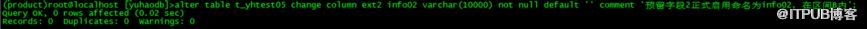 (3)测试将预留字段ext2调整到特定区间宽度10000,并命名为info02,修改comment内容,期望结果为立刻生效alter table t_yhtest05 change column ext2 info02 varchar(10000) not null default '' comment '预留字段2正式启用命名为info02,在区间B内';