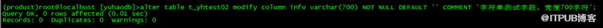 耗时很长,36秒执行完毕,符合预期(2.3) 测试字符串在最大宽度区间内64+的字段扩充操作,但是未达到触发索引变为前缀索引的范围,测试执行时长,期望结果为立刻执行完毕(2.3.1)扩到700,期望结果为立刻执行完毕alter table t_yhtest02 modify column info varchar(700) NOT NULL DEFAULT '' COMMENT '字符串测试字段,宽度700字符';