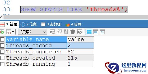 -- 查看连接线程数 SHOW STATUS LIKE 'Threads%';