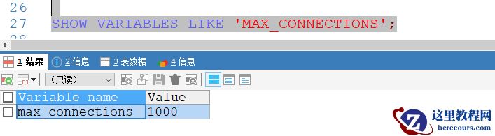-- 查看最大连接数 SELECT VARIABLE_VALUE FROM information_schema.GLOBAL_VARIABLES WHERE VARIABLE_NAME='MAX_CONNECTIONS'; SHOW VARIABLES LIKE 'MAX_CONNECTIONS'; -- 查看已使用的连接数 SHOW GLOBAL STATUS LIKE 'Max_used_connections';