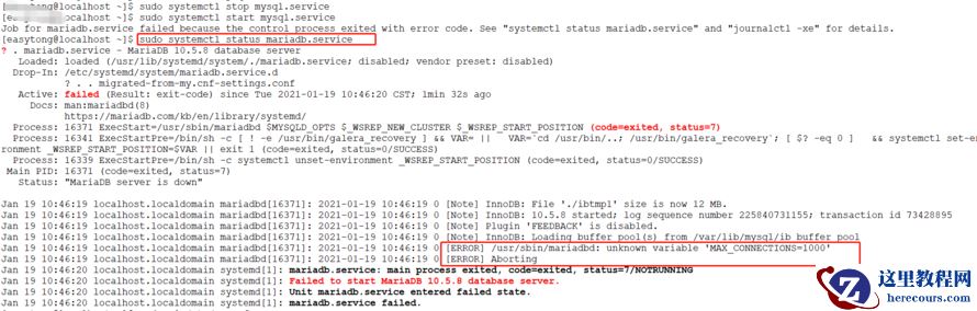 使用 sudo systemctl status mariadb.service 查询当前状态及报错问题