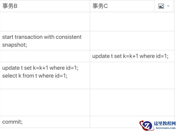 解读分析:这个活跃数组是关键,活跃数组是判断那个版本数据可见的关键,也就是实现rr隔离级别下一致性视图的关键,并且注意不一定说事务trx_id小就一定可见,事务trx_id比当前事务trx_id小,但是由于小的事务还未提交,它仍然不可见;RR解决幻读的原理:RR隔离级别是在事务开启的时候创建一致性视图,并在这个事务内一直依据这个一致性视图,而RC是在每个语句执行的时候创建一个一致性视图;所以RR隔离级别下同一个事务内看到的是一致性的,解决了幻读;RC隔离级别下同一个事务看到的可能不一样,会出现幻读,1)同一个事务下,从发出第一个query开始,之后查询到的数据是一样的,借助的是MVCC多版本控制(之前的版本并不是真实物理存在的),多版本控制是通过undo来计算出来的;2)undo log 是在ibdata1共享表空间中,如果遇到长事务,可能会导致产生很多undo,由于这些undo不能被覆盖,所以可能导致ibdata1暴涨(mysql 5.7支持在线收缩undo表空间),但是mysql应该不会出现 oracle ora-01555的问题;3)针对RR隔离级别下,查询是在一个事务里查询到的是一样的,但是关于dml操作,给查询有点区别,dml操作的时候,是以最新的版本为基础的,也就是说如下事务c更新后自动提交,事务B接下来更新是以事务c更新后的数据为基础的,同理delete 和insert也是如此!如下图所示,如果k的开始值是1,那么事务B中的查询到的值是3!