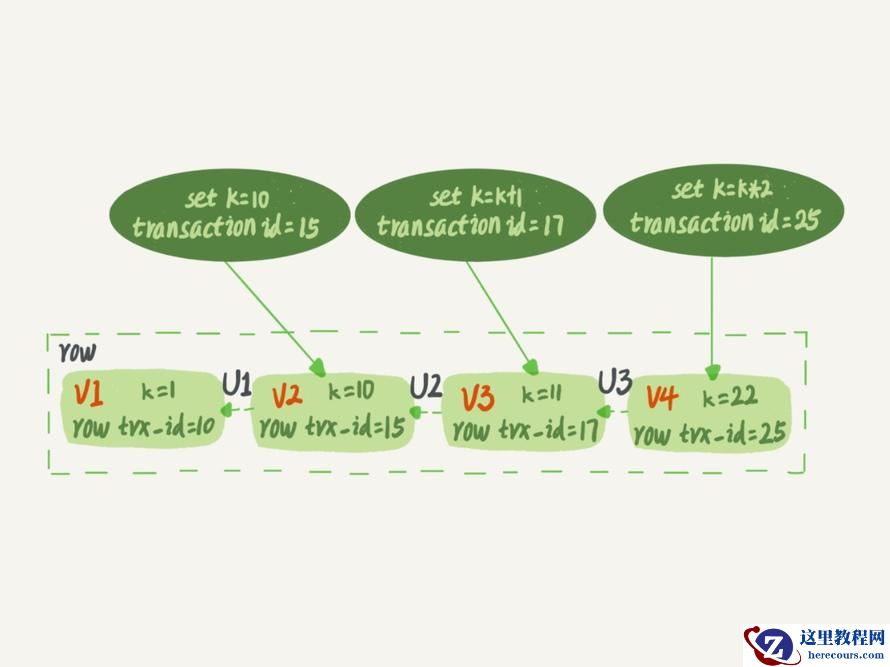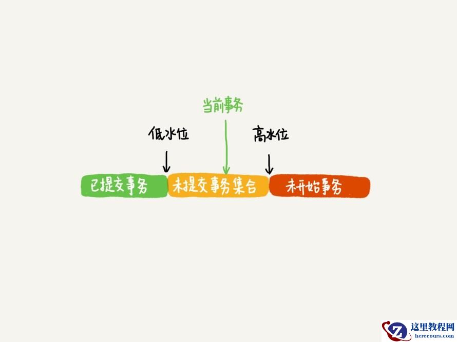 图 2 行状态变更图图中虚线框里是同一行数据的 4 个版本,当前最新版本是 V4,k 的值是 22,它是被 transaction id 为 25 的事务更新的,因此它的 row trx_id 也是 25。你可能会问,前面的文章不是说,语句更新会生成 undo log(回滚日志)吗?那么,undo log 在哪呢?实际上,图 2 中的三个虚线箭头,就是 undo log;而 V1、V2、V3 并不是物理上真实存在的,而是每次需要的时候根据当前版本和 undo log 计算出来的。比如,需要 V2 的时候,就是通过 V4 依次执行 U3、U2 算出来。明白了多版本和 row trx_id 的概念后,我们再来想一下,InnoDB 是怎么定义那个“100G”的快照的。按照可重复读的定义,一个事务启动的时候,能够看到所有已经提交的事务结果。但是之后,这个事务执行期间,其他事务的更新对它不可见。因此,一个事务只需要在启动的时候声明说,“以我启动的时刻为准,如果一个数据版本是在我启动之前生成的,就认;如果是我启动以后才生成的,我就不认,我必须要找到它的上一个版本”。当然,如果“上一个版本”也不可见,那就得继续往前找。还有,如果是这个事务自己更新的数据,它自己还是要认的。在实现上, InnoDB 为每个事务构造了一个数组,用来保存这个事务启动瞬间,当前正在“活跃”的所有事务 ID。“活跃”指的就是,启动了但还没提交。数组里面事务 ID 的最小值记为低水位,当前系统里面已经创建过的事务 ID 的最大值加 1 记为高水位。这个视图数组和高水位,就组成了当前事务的一致性视图(read-view)。而数据版本的可见性规则,就是基于数据的 row trx_id 和这个一致性视图的对比结果得到的。这个视图数组把所有的 row trx_id 分成了几种不同的情况。