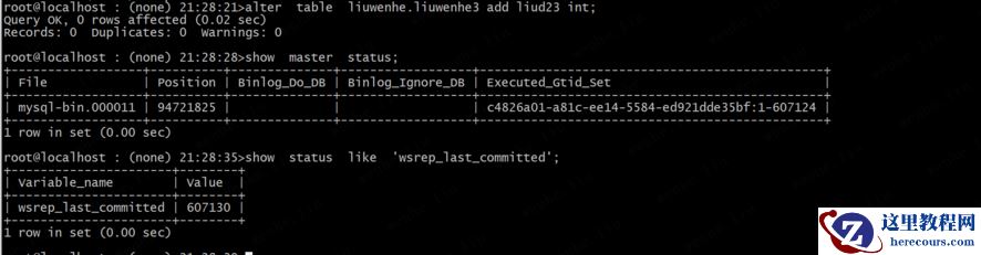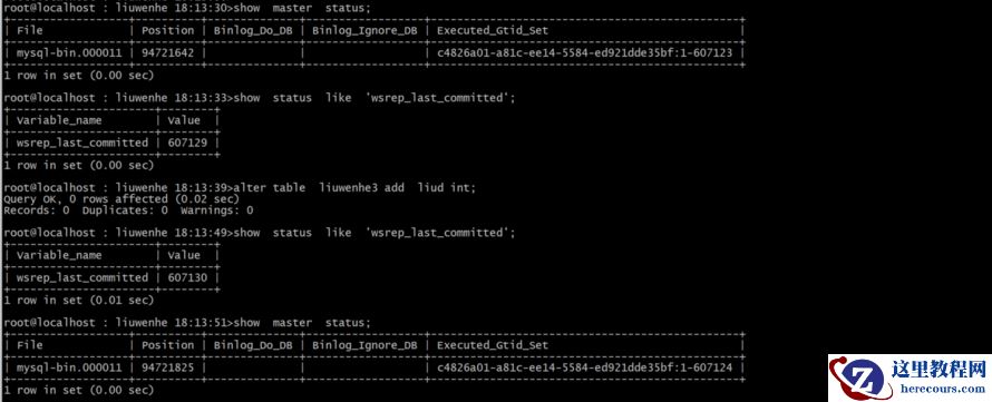 如下截图为正常执行事务,会导致gtid以及pxc全局gtid后面部分的xid加1