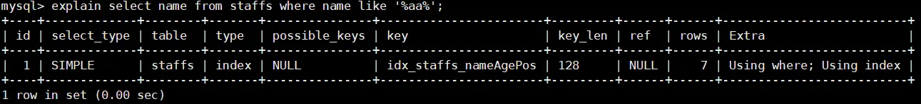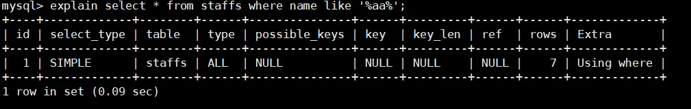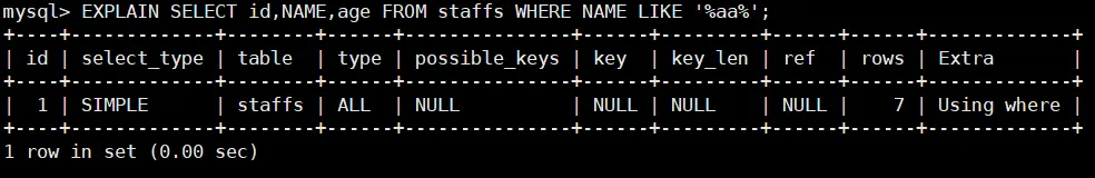 EXPLAIN SELECT NAME FROM staffs WHERE NAME LIKE '%aa%';