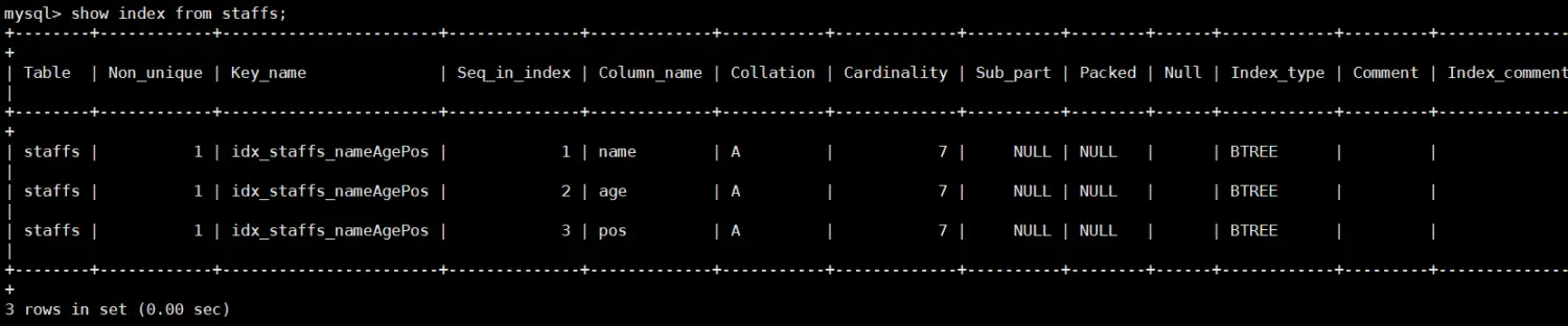 ALTER TABLE staffs ADD INDEX idx_staffs_nameAgePos(name, age, pos);