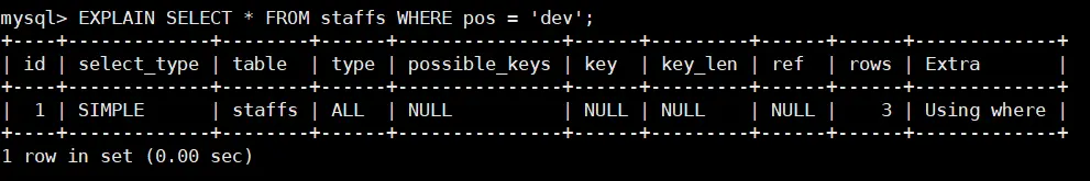 EXPLAIN SELECT * FROM staffs WHERE pos = 'dev';