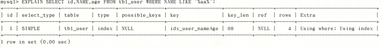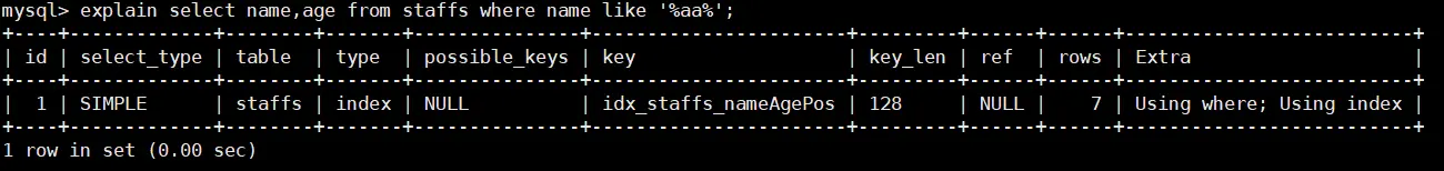 EXPLAIN SELECT id,NAME,age FROM staffs WHERE NAME LIKE '%aa%';
