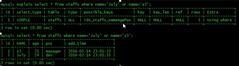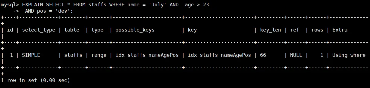 EXPLAIN SELECT name,age,pos FROM staffs WHERE name = 'July' AND age = 23 AND pos = 'dev';EXPLAIN SELECT * FROM staffs WHERE name = 'July' AND age = 23 AND pos = 'dev';EXPLAIN SELECT name,age,pos FROM staffs WHERE name = 'July' AND age > 23 AND pos = 'dev';