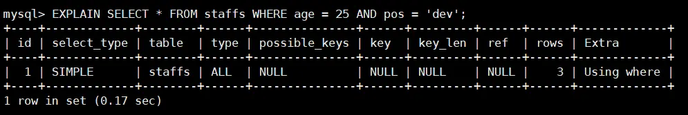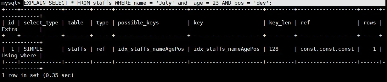 EXPLAIN SELECT * FROM staffs WHERE name = 'July' AND age = 23 AND pos = 'dev';