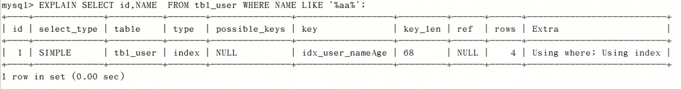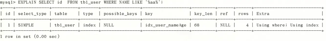 EXPLAIN SELECT id FROM tbl_user WHERE NAME LIKE '%aa%';