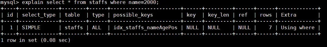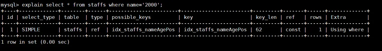 EXPLAIN SELECT * FROM staffs WHERE NAME = 'July';EXPLAIN SELECT * FROM staffs WHERE NAME = 'July' AND age = 25;--按顺序匹配EXPLAIN SELECT * FROM staffs WHERE NAME = 'July' AND age = 25 AND pos = 'dev';