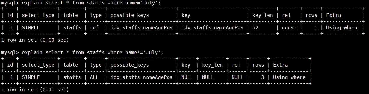 explain select * from staffs where name='July';explain select * from staffs where name!='July';