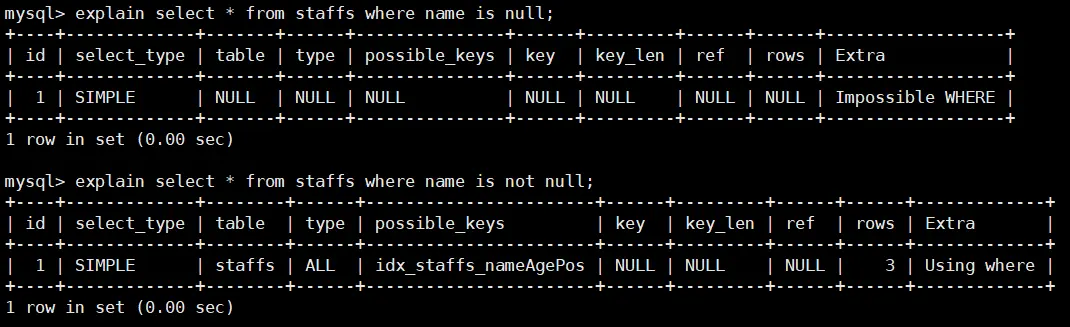 explain select * from staffs where name is null;explain select * from staffs where name is not null;