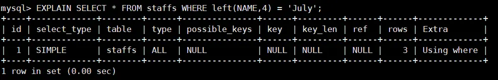 EXPLAIN SELECT * FROM staffs WHERE left(NAME,4) = 'July';