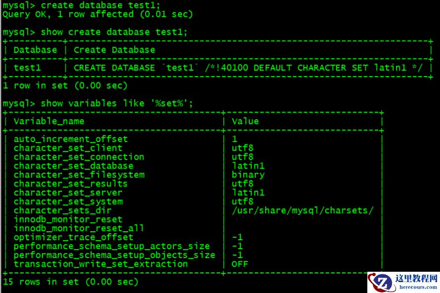 mysql> create database test1; mysql> show create database test1; mysql> show variables like '%set%';