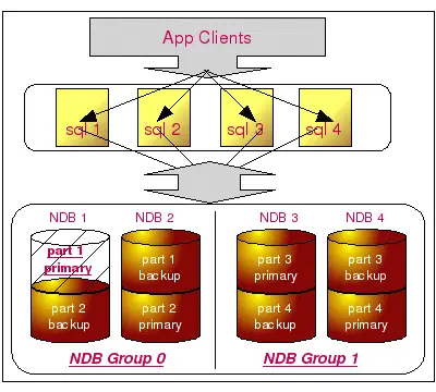 MySQL Cluster 的架构主要由两个层次两组集群来组成,包括