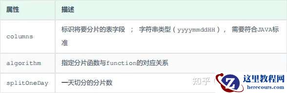<tableRule name="sharding-by-hour"> <rule> <columns>create_time</columns> <algorithm>sharding-by-hour</algorithm> </rule> </tableRule> <function name="sharding-by-hour" class="io.mycat.route.function.LatestMonthPartion"> <property name="splitOneDay">24</property> </function>