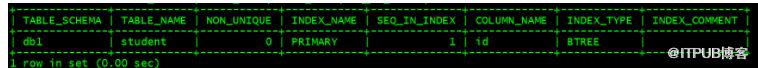 SELECT TABLE_SCHEMA, TABLE_NAME, NON_UNIQUE, INDEX_NAME, SEQ_IN_INDEX, COLUMN_NAME, INDEX_TYPE, CONCAT(COMMENT,INDEX_COMMENT) INDEX_COMMENT FROM INFORMATION_SCHEMA.STATISTICS WHERE TABLE_SCHEMA = 'db1' ORDER BY TABLE_SCHEMA,TABLE_NAME,INDEX_NAME,SEQ_IN_INDEX;