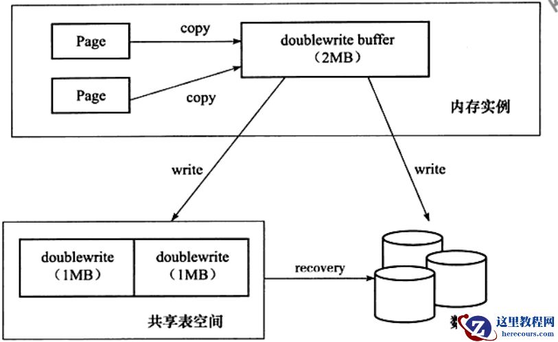double 由两部分组成,一部分是内存中 doublewrite buffer,大小为 2MB,另一部分是物理磁盘上共享表空间中连续的 128 个页,即 2 个区,大小同样为 2 MB。在对缓冲池的脏页进行刷新时,并不直接写磁盘,而是会通过 memcpy 函数将脏页先复制到内存中的 doublewrite buffer,之后通过 doublewrite buffer 再分两次,每次 1 MB 顺序地写入共享表空间的物理磁盘上,然后马上调用 fsync 函数,同步磁盘,避免缓冲写带来的问题。在完成 doublewrite 页的写入后,再将 doublewrite buffer 中的页写入各个表空间文件中,此时的写入则是离散的。如果操作系统在将页写入磁盘的过程中发生了崩溃,在恢复过程中,InnoDB 存储引擎可以从共享表空间中的 doublewrite 中找到该页的一个副本,将其复制到表空间文件,再应用重做日志。