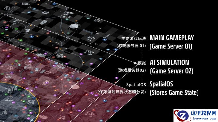 Josh Holmes带领343 Industries团队在开发《光环5》战区模式时,就受限于服务器承载量上限的阻碍,他们不得不限制玩家、AI数量,简化AI逻辑来保证游戏体验。而在《Scavengers》中,场内存在的AI生物多达上百个。SpatialOS采用“AI负载拆分”的方法实现了这一游戏需求。据官方介绍,AI逻辑属于CPU计算密集型、但对延迟不太敏感的业务,像这些与核心系统耦合度不高的模块都能拆分出来放在另一台服务器上。