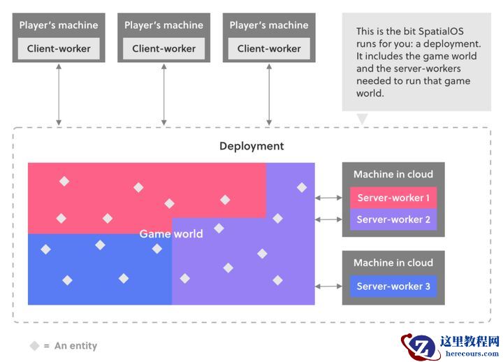 目前阶段,这一系统主要分成两个部分:开发侧的SpatialOS与运营侧的zeuz。不妨先拿文章开头所说的游戏实验来说明SpatialOS是什么。《Scavengers》的“Winter Sports”测试包含了数个特性,千人以上的真实玩家,即时游戏,3D模型,物理碰撞。网络游戏发展至今,支持千人同屏、实时互动的3D网络游戏并不多见,除了硬件渲染上的压力,服务器技术也是难点之一。玩家在本地输入的指令需要上传至服务器,处理后发送给指令发出者以及相关的玩家,最终客户端根据返回的数据将结果显示在屏幕上。在这一过程中,交由服务器处理的数据种类,发送的频率等,都会增加服务器的运行压力,而同屏的玩家数量将会使这一问题更加复杂。为了实现《Scavengers》“千人同屏”的效果,必须对网络层进行革新,在此情况下SpatialOS呼之欲出。SpatialOS采用的可扩展性架构突破了传统单服务器的限制,它相当于将不同的DS(Dedicated Server,专用服务器)串联起来,在所有DS上还有一个网络层来负责所有游戏状态的管理。在玩家眼中,它看起来就是一个无缝的单一游戏世界。除此之外,SpatialOS还自带网络层同步实现方案,便于跨服活动以及物理碰撞处理的实现。