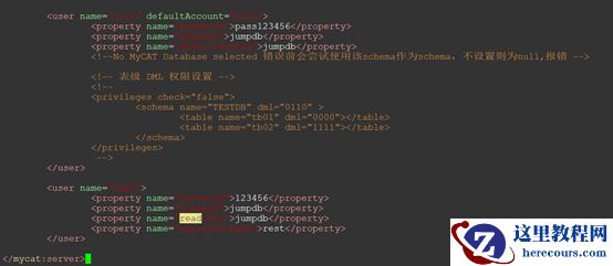 以下为schema:test添加了两个用户root和user,应用使用这两个账号连接mycat进行数据的操作,如果不用user用户,可以删除里面的配置。