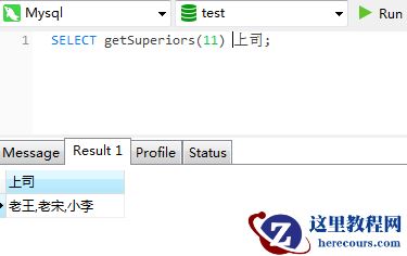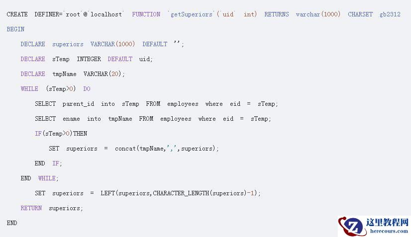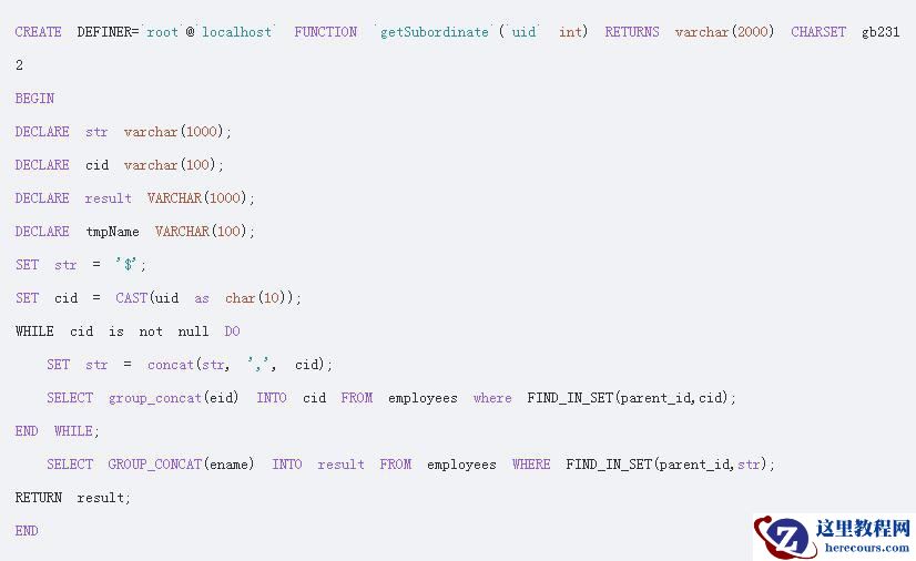 3.查询小天的所有上司。这里肯定没法直接查,只能用循环进行循环查询,先查直接上司,再查直接上司的直接上司,依次循环,这样麻烦的事情,还是得先建立一个存储过程:睁大眼睛看仔细了,接下来是骚操作环节: