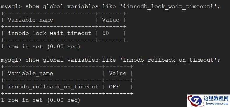 mysql> show global variables like '%innodb_lock_wait_timeout%'; mysql> show global variables like 'innodb_rollback_on_timeout';