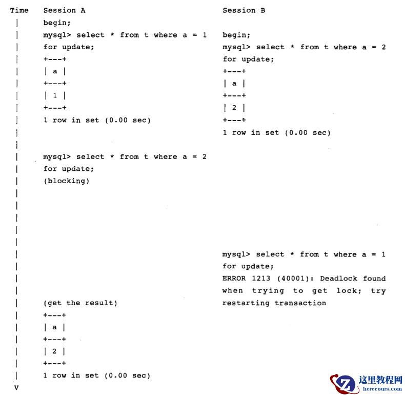 通过上图我们捕获到了1213这个错误,也就是发生了死锁。为什么发生死锁,相比大家都很清楚,是因为会话A和会话B的资源在互相等待。但是在1213异常抛出后,会话A为什么会立刻获取记录为2的结果呢?难道是因为会话B回滚了?可是前一章节刚刚讲了锁超时会话不回滚的啊……其实,大家猜的没错,会话B 的确回滚了,锁超时会话不回滚也是对的,但是,死锁例外。也就是说,当抛出1213异常后,我们不需要人为的对事务进行回滚。在Oracle中,产生死锁的原因大多是因为没有对外键建立索引,而在innodb存储引擎会自动为其添加,如果人为删除外键上的索引就会抛出异常。
