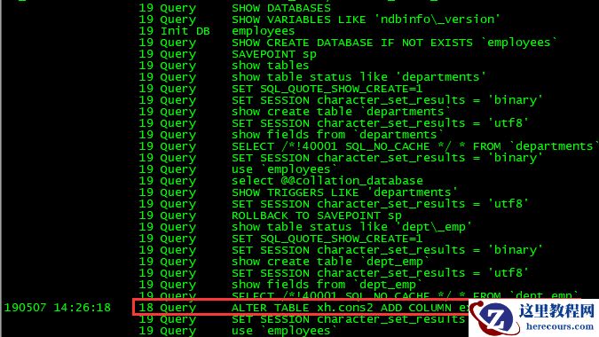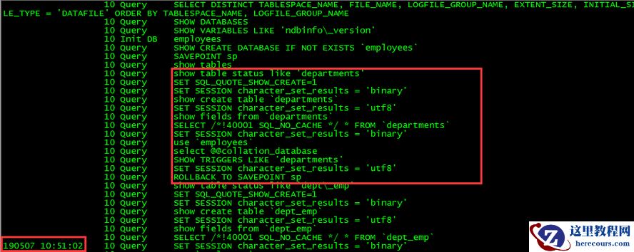 2.观察通用日志,发现已经employees.departments表已经完成备份