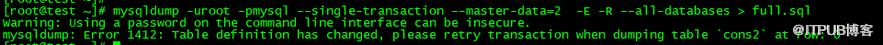 mysqldump -uroot -pmysql --single-transaction --master-data=2 -E -R --all-databases > full.sql