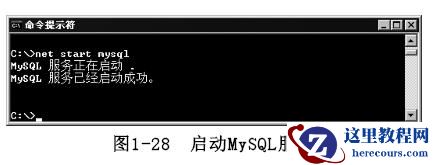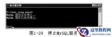 MySQL服务,具体命令如下:net stop mysql执行完上述命令,显示的结果如图1-29所示。
