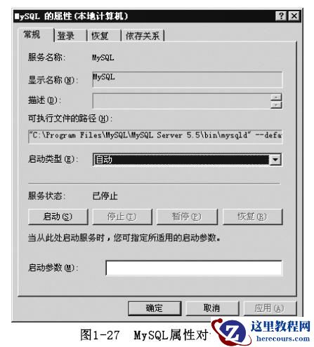 从图1-26可以看出,MySQL服务没有启动,此时可以直接双击MySQL服务项打开属性对话框,通过单击“启动”按钮来修改服务的状态,如图1-27所示。