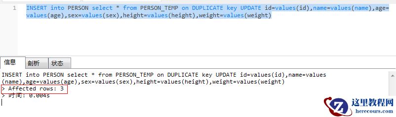 现在需要用person_temp表中的数据去更新person表的数据,根据上面的数据分析可知,person表的主键为id,person——temp的两条记录一条对应执行update,一条执行insert,返回影响条数为3。下面我们验证一下。执行语句:
