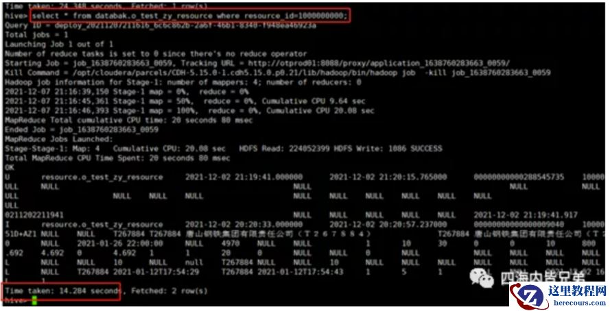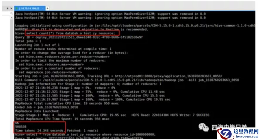 好吧Hive中count一下24秒这里之所以是50多万,是因为源库中update全表。而hive不支持修改,全过来。数据量翻了一倍,时间用了100倍。