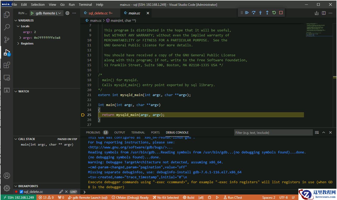 {// Use IntelliSense to learn about possible attributes.// Hover to view descriptions of existing attributes.// For more information, visit: https://go.microsoft.com/fwlink/?linkid=830387"version": "0.2.0","configurations": [{"name": "gdb Remote Launch","type": "cppdbg","request": "launch","program": "/soft/mysql-5.7.26/build/bin/mysqld","args": [],"stopAtEntry": true,"cwd": "${workspaceFolder}","environment": [],"externalConsole": false,"MIMode": "gdb","miDebuggerPath": "/usr/bin/gdb","miDebuggerArgs": "gdb","linux": {"MIMode": "gdb","miDebuggerPath": "/usr/bin/gdb","miDebuggerServerAddress": "192.168.1.249:2333",},"logging": {"moduleLoad": false,"engineLogging": true,"trace": false},"setupCommands": [{"description": "Enable pretty-printing for gdb","text": "-enable-pretty-printing","ignoreFailures": true}]}]}几个注意的地方:? 应该是 "request": "launch", 不是 “attach”, 此后也并不需要记录进程ID? 需要填对 "miDebuggerServerAddress": "192.168.1.248:2333", 有这个设置才会开启 gdb 远程调试? "engineLogging": true 可以看到 gdb 自身的详细消息? 必须是 "externalConsole": false 否则报错? /soft/mysql-5.7.26/build/bin/mysqld 在 gdbserver 和 launch.json 里都要填一次,即mysql编译后的启动程序之后就可以使用调试功能了, 添加断点, 监视等等, 如图: